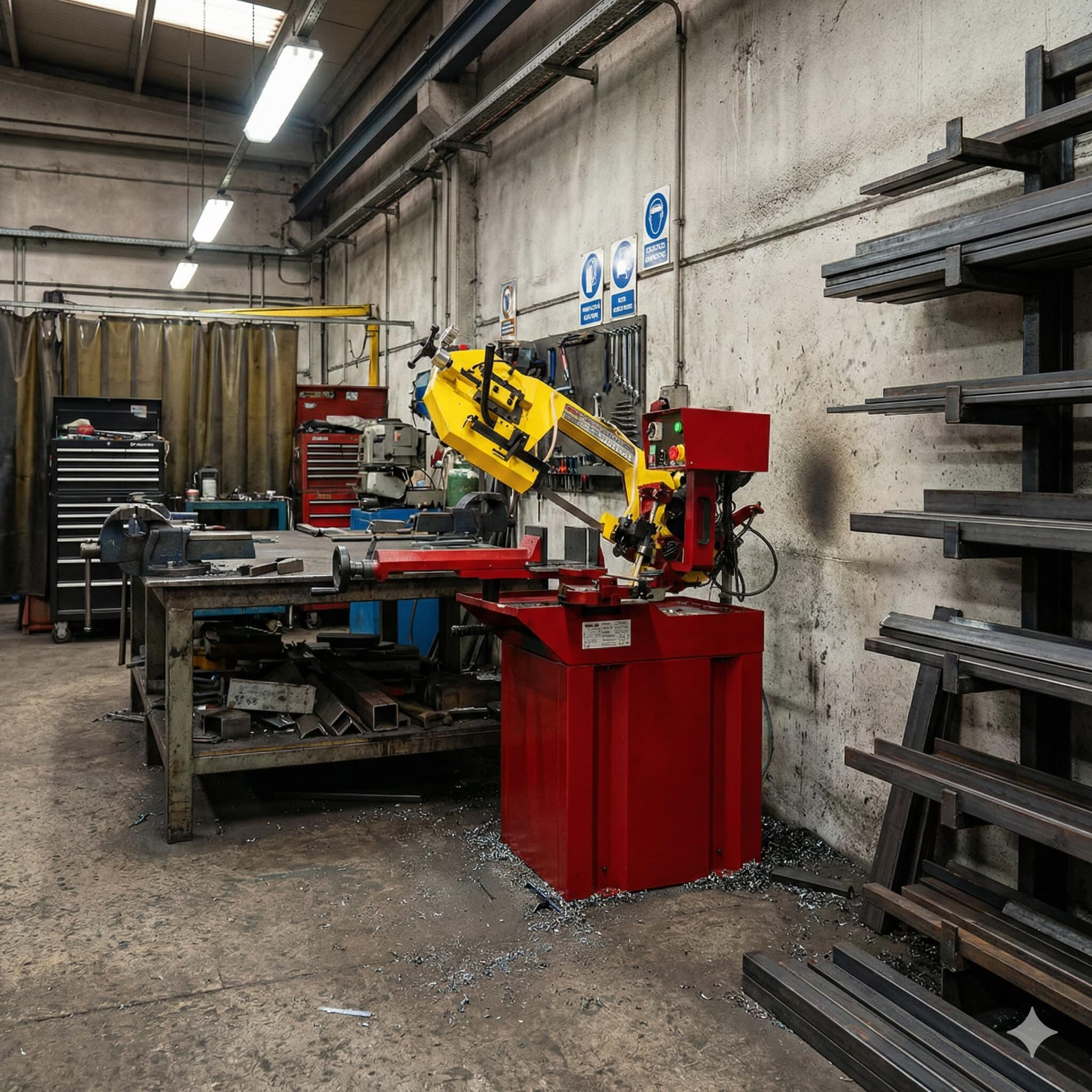 Segatrice a nastro orizzontale a pavimento per piccole e medie officine, ideale per materiale pieno e strutturale.
