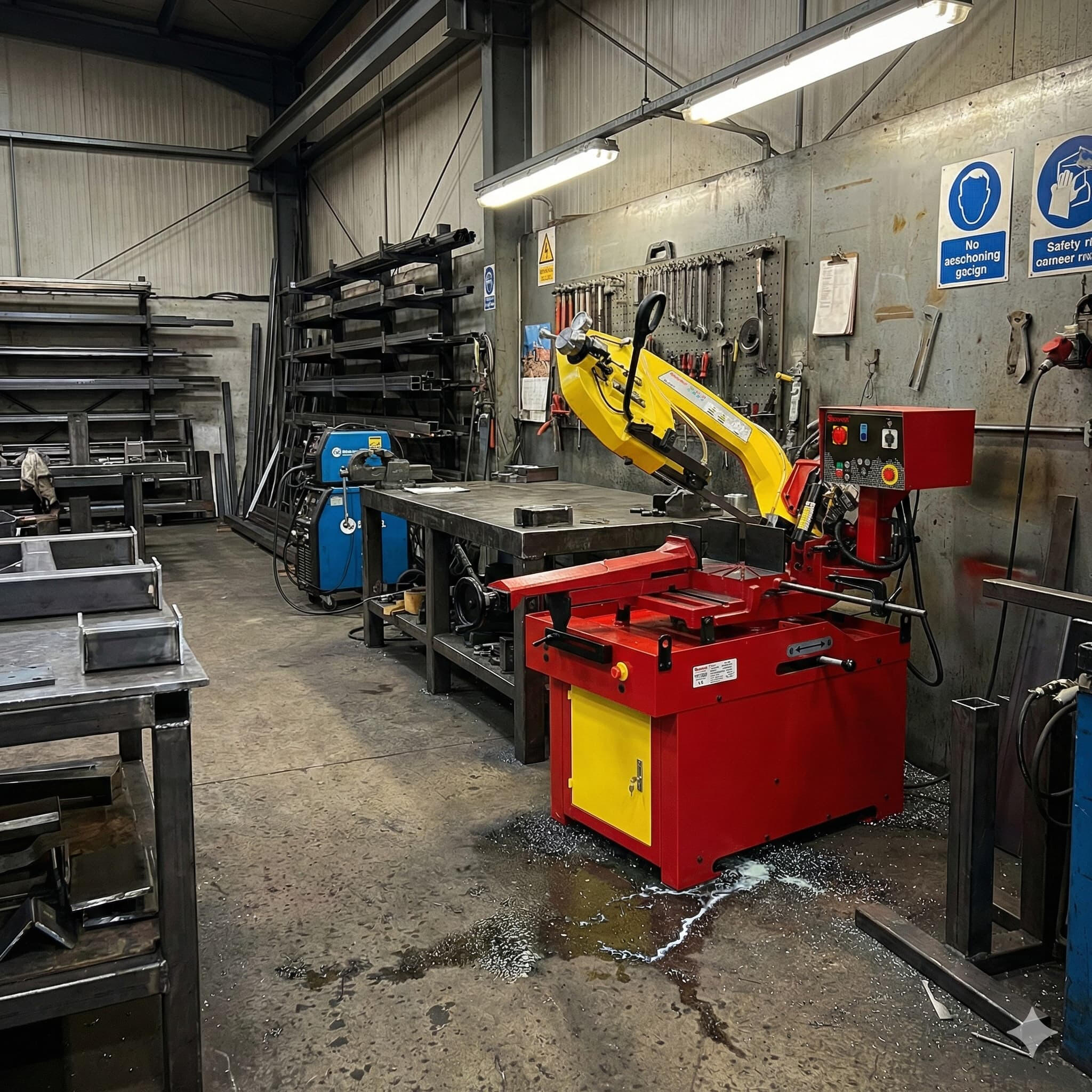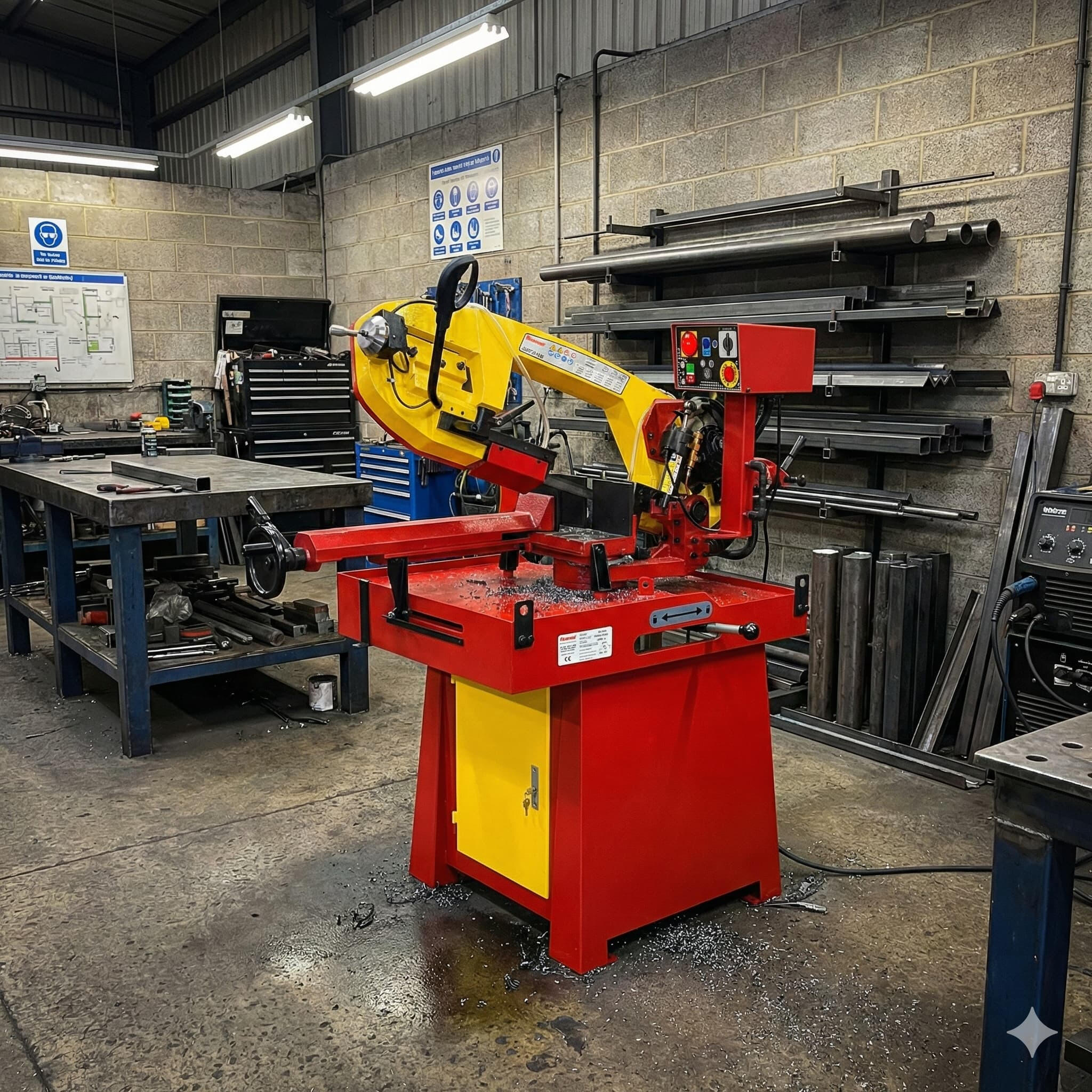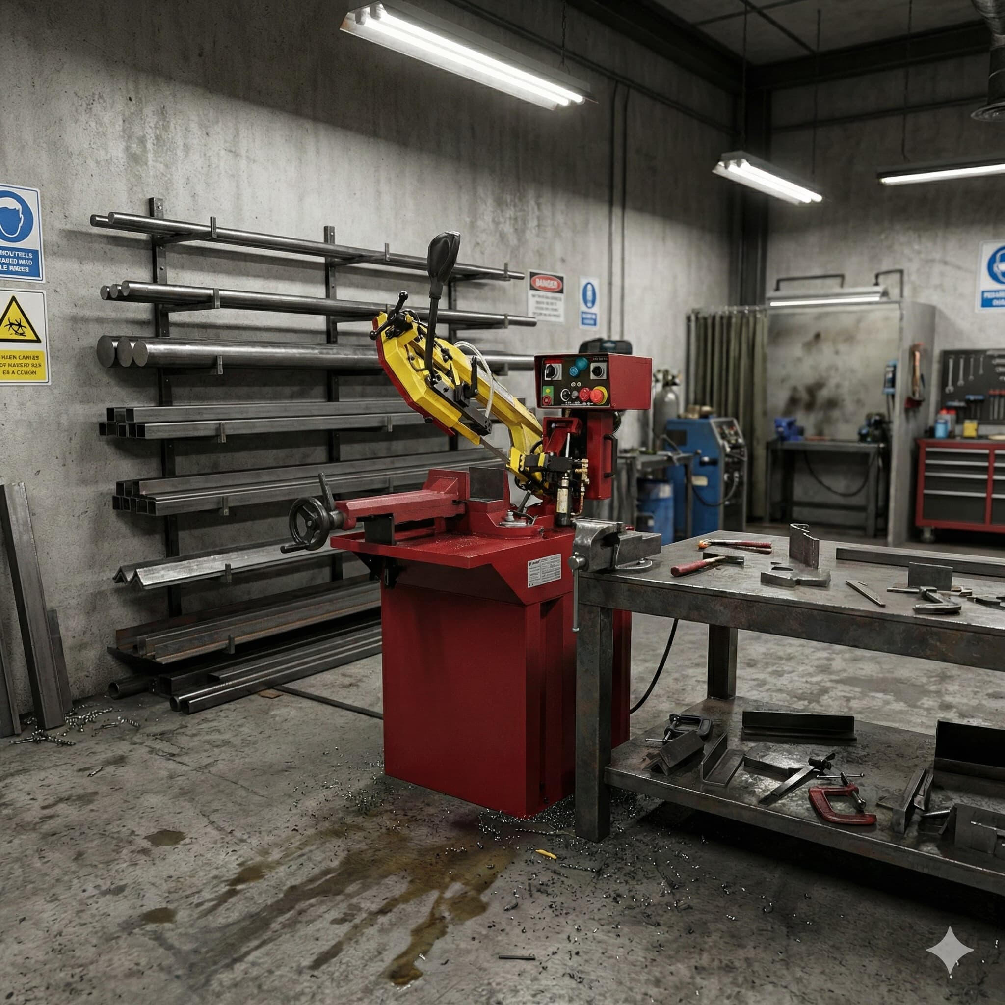 Segatrice a nastro orizzontale a pavimento per piccole e medie officine, ideale per materiale pieno e strutturale.